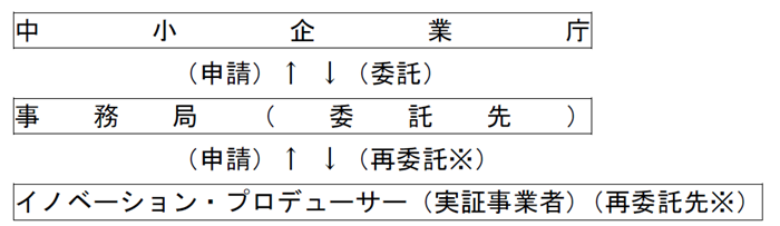 本公募は、上記実証事業を行うイノベーション・プロデューサーの公募となります。採択された申請者は、中小企業庁から委託された「事務局」との間で再委託契約を締結することになります。