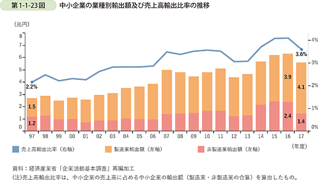 第1-1-22図は、企業規模別の直接輸出企業の割合の推移である1。これを見ると、中小企業の輸出企業割合は長期的に増加傾向にあることが分かる。また、中小企業の輸出額と売上高に占める輸出額の割合の推移を見ると、足元では減少が見られるものの、長期的にはいずれも増加傾向にあることが分かる(第1-1-23図)。