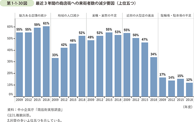 次に、最近3年間の来街者数の変化について推移を見ると、2018年度は「減った」と回答した割合は依然として5割を超えているものの、2009年度以降その割合は改善傾向で推移している(第1-1-29図)。続いて、来街者が減少した要因について見ると、2018年度は「魅力のある店舗の減少」が最も多くなっている。また、「地域の人口減少」を来街者の減少要因として回答する割合が、2009年度から2018年度にかけて著しく増加していることが見て取れる(第1-1-30図)。