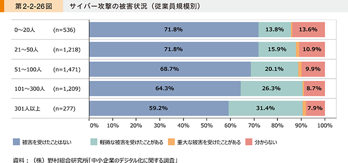 第2-2-26図は、従業員規模別にサイバー攻撃の被害状況を示したものである。これを見ると、従業員数が多い企業ほど、サイバー攻撃を受けている割合が高い傾向にあり、301人以上の企業では3割以上が被害を受けたことがあると分かる。