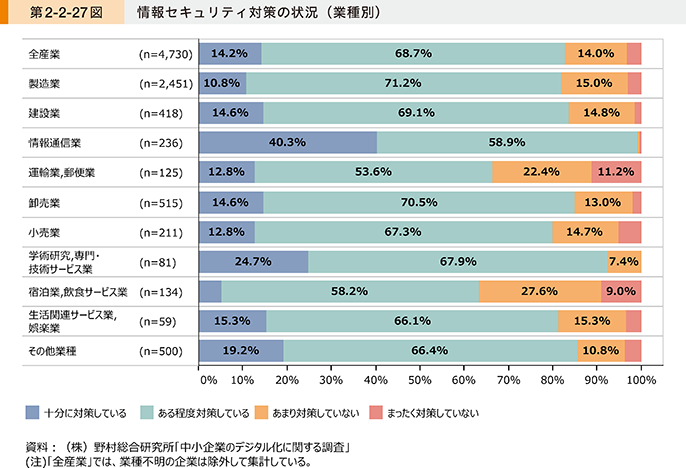 第2-2-27図は、業種別に情報セキュリティ対策の状況を示したものである。これを見ると、「十分に対策している」企業は、全体の14.2%にとどまることが分かる。