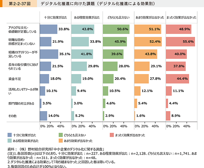 第2-2-37図は、デジタル化推進による効果別に、デジタル化推進に向けた課題を示したものである。これを見ると、効果が出なかったと実感している企業は、効果が出たと実感している企業に比べ、明確な目的・目標が定まっていないことや資金不足を挙げる割合が高い傾向にあることが分かる。効果が出なかったと実感している企業では、アナログな文化・価値観の定着を挙げる割合が半数を超えていることも確認される。