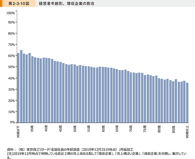 第2-3-10図は、経営者年齢別に増収企業の割合を見たものである。これを見ると、経営者年齢が30代以下の企業では増収割合が6割程度であるのに対し、80代以上の企業では4割程度となっており、経営者年齢が上昇するほど増収企業の割合が低下していることが分かる。