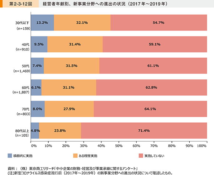 第2-3-12図は経営者年齢別に2017年から2019年の間の新事業分野への進出の状況について確認したものである。これを見ると、経営者年齢が若い企業ほど、新事業分野進出に取り組んだ企業の割合が高いことが分かる。