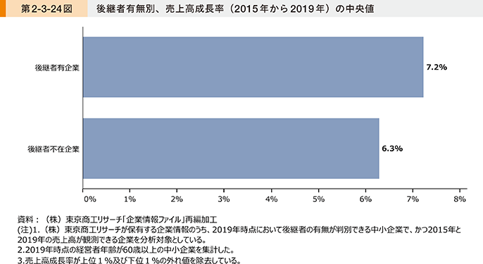 第2-3-24図は後継者有無別に、2015年から2019年の売上高成長率の中央値を見たものである。これを見ると、後継者有企業において売上高成長率が高い傾向にあることが見て取れる。