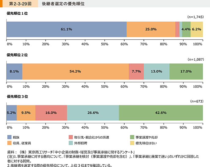 続いて、第2-3-29図は後継者を選定する際の優先順位について確認したものである。優先順位1位で最も高いのは「親族」(61.1%)で、次いで「役員、従業員」(25.0%)となっている。続いて優先順位2位を見ると、「役員、従業員」が最も高く5割を超えており、また「事業譲渡や売却」を検討する者も一定程度存在することが分かる。優先順位3位では、「事業譲渡や売却」、「外部招へい」を合わせると6割を超えている。このことから、多くの経営者はまず「親族」を第一候補として検討し、次いで「役員、従業員」、そして「事業譲渡や売却」、「外部招へい」の順に検討している様子がうかがえる。ただし、第2-3-20図で見たとおり、近年同族承継の割合が34%程度であることを考慮すると、必ずしも希望通りに親族への承継がかなわないケースも増えてきていると考えられ、事業継続の意志がある場合は早めに後継候補者の意思確認を進めていくことで、様々な選択肢を検討することが可能になるといえよう。