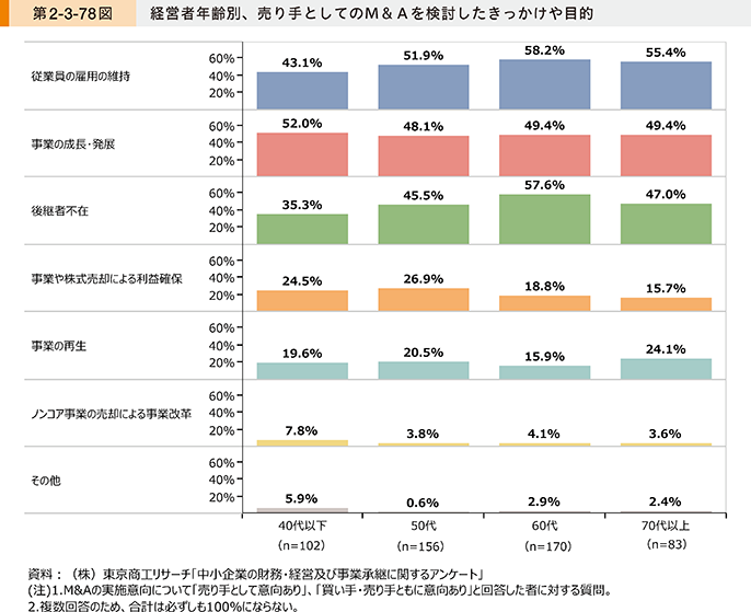 次に第2-3-78図は、経営者年齢別に売り手としてのM&Aを検討したきっかけや目的について確認したものである。世代間の差に着目すると、おおむね経営者年齢が高い企業では「従業員の雇用の維持」や「後継者不在」といった事業承継に関連した目的の割合が高い傾向にあることが分かる。一方で、「事業や株式売却による利益確保」の割合は経営者年齢が若い企業で高い傾向にある。