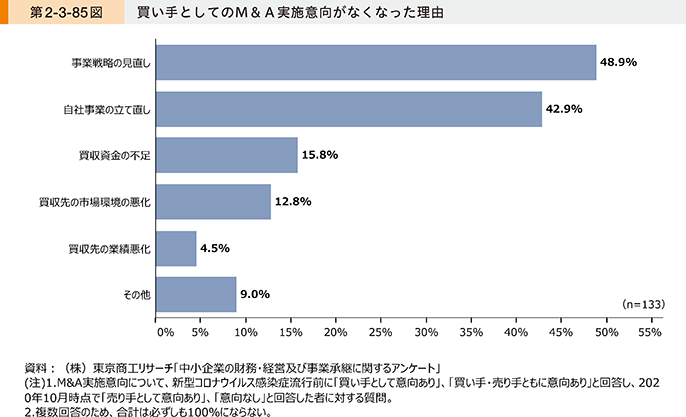 第2-3-85図は感染症流行を受けて、買い手としてのM&A実施意向がなくなった理由について確認したものである。これを見ると、「事業戦略の見直し」や「自社事業の立て直し」を理由として挙げる企業が多く、従来の成長戦略からの転換を迫られてM&Aを断念した様子がうかがえる。