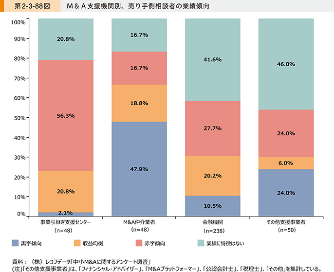 第2-3-88図はM&A支援機関別に売り手側相談者の業績傾向について確認したものである。これを見ると、事業引継ぎ支援センターでは「赤字傾向」が56.3%となっており、業績不振企業の相談にも多く対応している様子が見て取れる。一方で、M&A仲介業者では「黒字傾向」が47.9%となっており、業績好調企業が譲渡の相談に行っている様子がうかがえる。