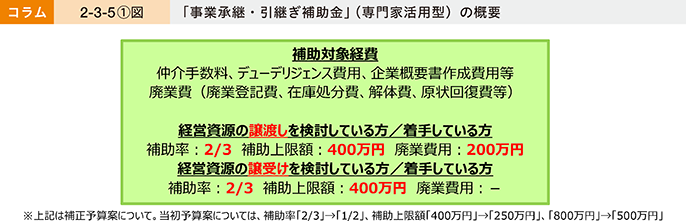 こうしたM&Aの際のリスク回避の取組を支援するため、「事業承継・引継ぎ補助金」(令和2年度第3次補正予算及び令和3年度当初予算)では、DD費用などのM&A実施時の専門家活用にかかる費用を補助することとしている。DD費用を直接補助することで、中小企業のM&Aにおいても、DDを実施しやすい環境を整備している(コラム2-3-5〔1〕図)。