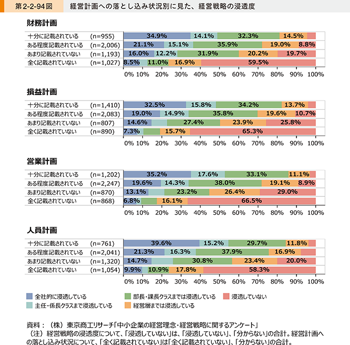 続いて、第2-2-94図は、経営戦略の浸透度を、経営計画への落とし込み状況別に見たものである。いずれの項目においても、経営計画へ十分に記載されているほど、経営戦略が社内に広く浸透していることが分かる。策定された経営戦略を従業員に浸透させていく上では、具体的な数値や施策を計画に落とし込み、内容を充実させることが重要といえよう。
