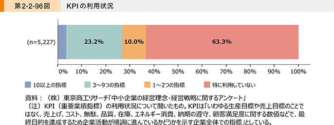 第2-2-96図は、KPIの利用状況を見たものである。KPIを利用している企業は36.7%と一定数存在するものの、利用していない企業の方が多くなっている。