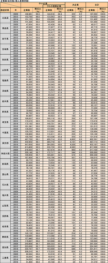 6表 都道府県別規模別企業数(民営、非一次産業、2009年、2012年、2014年、2016年)