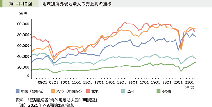 続いて、我が国企業の海外現地法人の売上高の推移を見たものが第1-1-10図である。各地域においておおむね回復傾向にあり、北米を除き、感染症流行前の水準まで回復している。