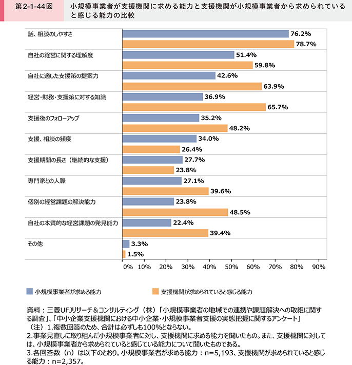 最後に、小規模事業者が支援機関に求める能力と支援機関が小規模事業者から求められていると感じる能力の違いについて確認する(第2-1-44図)。これを見ると、「経営・財務・支援策に対する知識」、「自社に適した支援策の提案力」、「個別の経営課題の解決能力」は支援機関において回答率が高いものの、小規模事業者の回答率とのギャップが大きく、具体的な解決策の引き出しに対する双方の重要度の違いが確認できる。一方で、「話、相談のしやすさ」は、小規模事業者・支援機関ともに回答率が最も高く、小規模事業者の現状や抱える悩みに傾聴する能力を重視している点は、双方ともに共通していることがうかがえる。