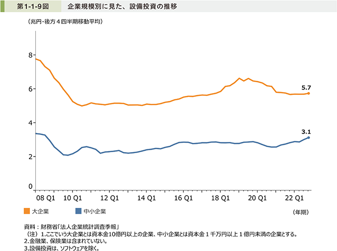 第1-1-10図は、国内民間設備投資(名目)及び中小企業設備投資の推移と見通しについて見たものである。これを見ると、国内民間設備投資額は感染症流行後に上昇しており、先行きについて政府経済見通しでは、2023年度(令和5年度)において103.5兆円の見通しを示している。中小企業の設備投資についても、2022年度は2021年度からの増加が見込まれている。