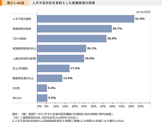 第2-1-44図は、人手不足対応を目的とした設備投資の効果を見たものである。これを見ると、「人手不足の緩和」と回答する企業の割合が過半数で最も高く、次いで、「残業時間の削減」、「コストの削減」と回答する割合が高い。