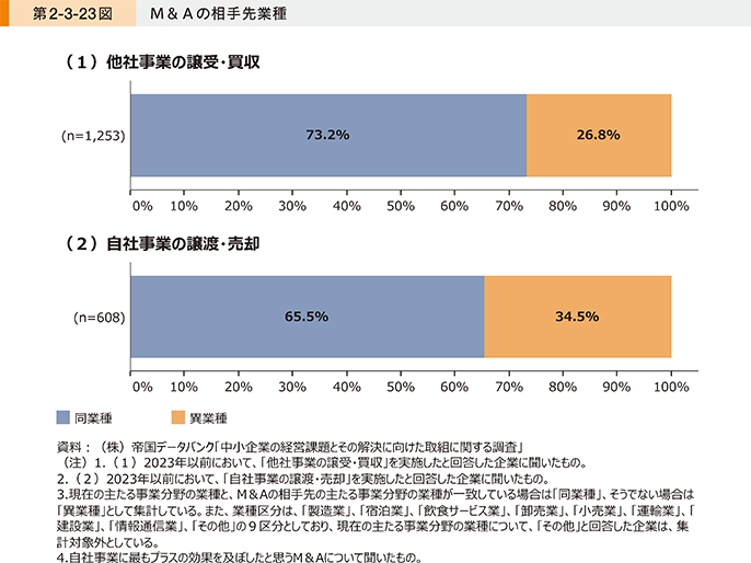 まずは、M&Aの相手先について見ていく。第2-3-23図は、M&A実施時における相手先の業種を確認したものである。これを見ると、「他社事業の譲受・買収」、「自社事業の譲渡・売却」のいずれにおいても、「同業種」と回答した企業の割合の方が高いことが分かる。「同業種」の方が、M&Aによるシナジー効果を見込みやすいことが一因であると考えられる。