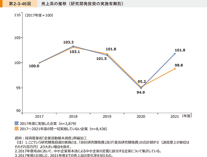 ここでは、経済産業省「企業活動基本調査」のパネルデータを用いて、イノベーションの効果を分析する。第2-3-46図は、研究開発投資の実施有無別に、売上高の推移を見たものである。研究開発投資について、「2017年度に実施した企業」は「2017~2021年度の間一切実施していない企業」に比べて、2021年度における売上高の成長度合いが高いことが分かる。