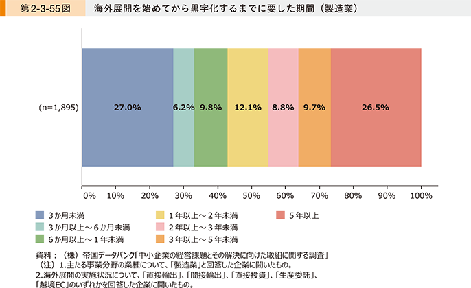 第2-3-55図は、製造業について、海外展開を始めてから黒字化するまでに要した期間を見たものである。これを見ると、「3か月未満」と早期に黒字化を達成している企業が3割程度存在する一方で、同程度、「5年以上」と回答している企業も存在することが分かる。