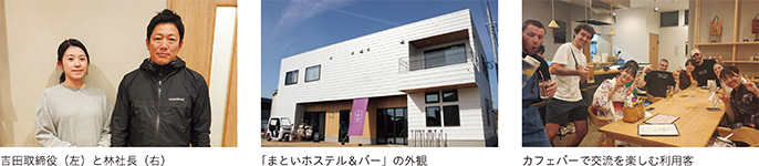 同社は、ゲストハウスの開業に向けた事業計画策定や事業再構築補助金の申請書作成において、同商工会から手厚い支援を受けた。補助金申請に関する手続きのほかにも、同社をPRするためのインフルエンサーの紹介や動画作成の支援も受けており、吉田取締役は「商工会の支援なしでは開業に至ることはできなかった」と振り返る。2023年2月に外国人旅行者向けゲストハウス「まといホステル&バー」を開業。内外装は、リノベーション事業で培った自社のデザイン力をいかした。館内には、ベッド数22床の宿泊室のほか、宿泊者以外も利用できるカフェバーを置き、宿泊者同士あるいは地元住民も交えた交流スペースとなっている。スタッフの採用では、宿泊者とのコミュニケーション能力を重視してネイティブレベルの英語力とビジネス会話レベルの日本語力を必須とし、外国人と日本人の橋渡しができる人材を確保した。