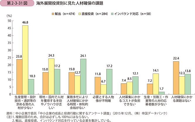 まず、人材確保における課題について見てみると、輸出と直接投資については「生産管理・設計技術・通訳等の求める質の人材が少ない」、インバウンド対応については「業務多忙により人材確保にかかる時間・体制的余裕がない」と回答する企業の割合が高いことが分かる。