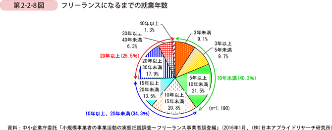 次に、フリーランスになる前の職業の就業年数(第2-2-8図)を見ると、3年未満と回答した者が9.1%いるが、残る90.9%は3年以上と回答しており、フリーランスになるまでに多くの者が一定期間の実務経験を有していることが分かる。他方で、就業年数を10年間隔で分けてみると、前職の就業年数が、〔1〕10年未満までの合計が40.3%、〔2〕10年以上20年未満までの合計が34.3%、〔3〕20年以上30年未満までが17.9%、〔4〕30年以上40年未満までが6.3%、〔5〕40年以上が1.3%となっている。このことから、就業年数が伸びるに従い、フリーランスになる傾向が弱まるともいえよう。