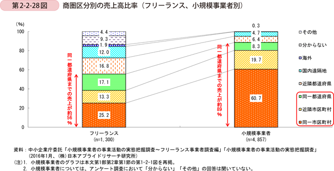フリーランスが営んでいる事業について、直近1年間の商圏区分別の売上高比率を聞いたものが、第2-2-28図(左図)である。「同一市区町村」における売上げが25.2%と最も多く、「同一都道府県」まで含めると、これらの地域における売上高比率が半分以上(55.6%)を占めている。このことから、フリーランスも小規模事業者と同様に、近距離にいる事業者等が主な取引先であることが分かる。一方、取引先が「国内遠隔地」(12.0%)と「海外」(1.9%)の売上高比率も合わせて13.9%を占めている。第1-2-1図で小規模事業者の商圏区分別の売上高比率を見たが、同一都道府県までの売上高比率が約9割(88.7%)を占めている小規模事業者と対比すると、フリーランスは、より広い商圏を持っていることが分かる。