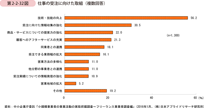 フリーランスが仕事の受注に向け、実際にどのような取組を行っているかを複数回答で聞いたものが、第2-2-32図である。フリーランスが最も多く実施している取組は「技術・技能の向上」で56.2%となっており、続いて「受注に向けた情報収集の強化」(30.5%)、「商品・サービスについての提案力の強化」(22.0%)となっている。