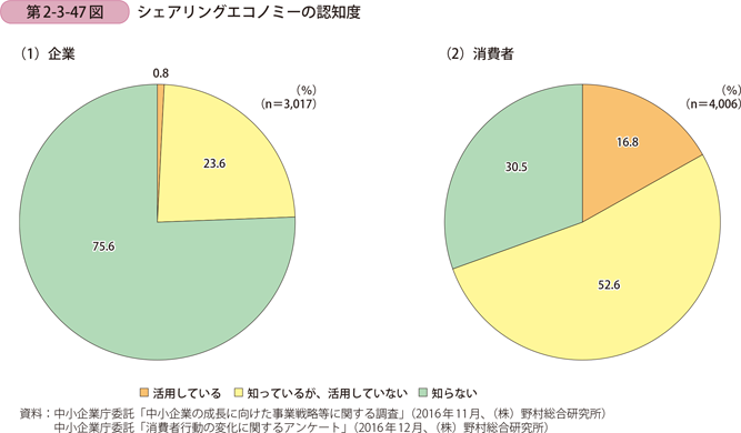 ここからは、中小企業のシェアリングエコノミーのサービスに対する認知度等について、消費者の視点も交えながら分析していく。まず、第2-3-47図は、シェアリングエコノミーに対する認知状況を企業と消費者に分けて見たものである。(1)企業においては、活用している割合は1%未満であるが、「知っているが、活用していない」を含めると約25%が認知している。