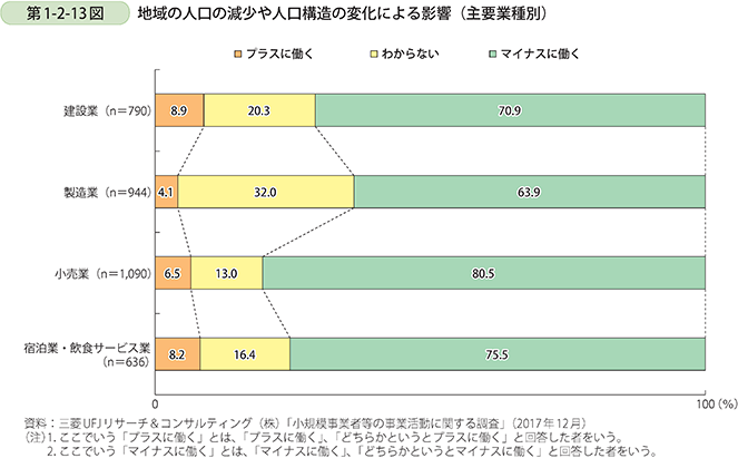 第1-2-13図は、地域の人口の減少や人口構造の変化による影響について見たものである。いずれの主要業種についても「地域の人口の減少や人口構造の変化」はマイナスに働くとする割合が高い。特に「小売業」と「宿泊業・飲食サービス業」がマイナスに働くとしている割合が高く、第1-2-12図において「売上低下・売上高の伸び悩み」が最も課題となっている理由の一つであると推察される。