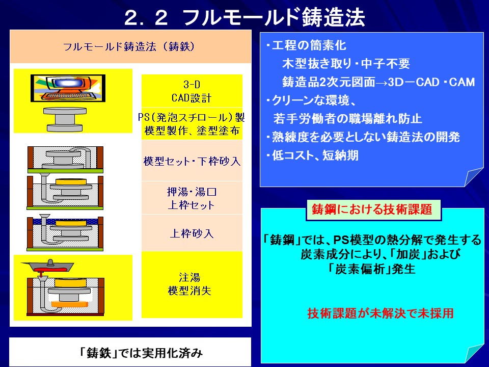 | 産業分野でのニーズ対応 | 高効率化(同じ生産量に対するリソースの削減)、高効率化(工程短縮)、高効率化(人件費削減)、高効率化(生産性増加)、高効率化(ベルマウスなどの船舶装備機器の中・大型鋳鋼品の生産技術の抜本的改革~木型による鋳造法案からフルモールド法への抜本的技術転換(革新))、低コスト化 |