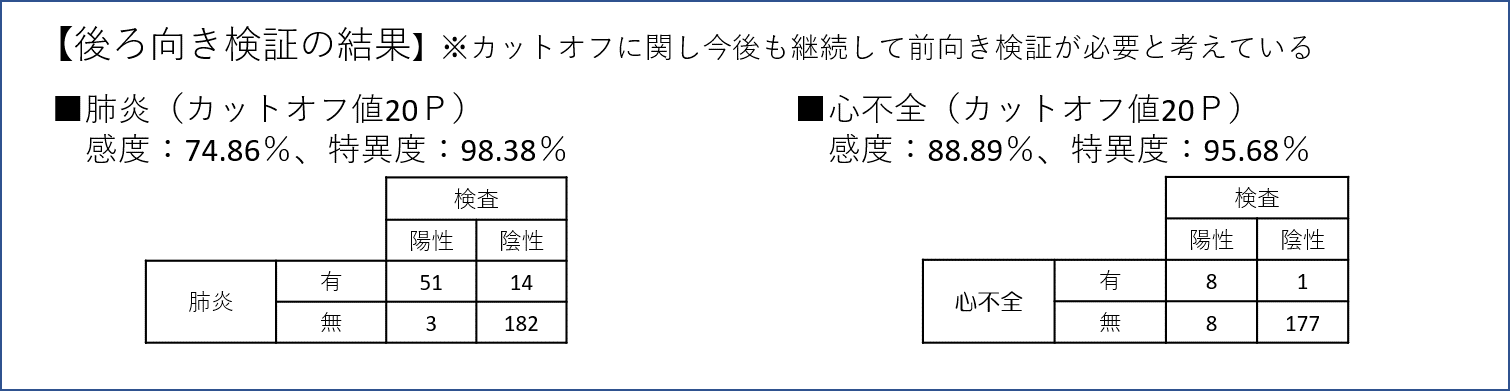 ・精度:介護施設で後ろ向き検証した結果、肺炎(65件)で、感度:74.86%、特異度:98.38%。心不全(9件)で、感度:88.89%、特異度:95.68%