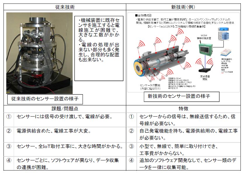 | プロジェクト名 | 産業設備、インフラ、車両等の無線によるIoT化を実現する小型ハーベスティングセンサーとデータ処理システムの開発 |