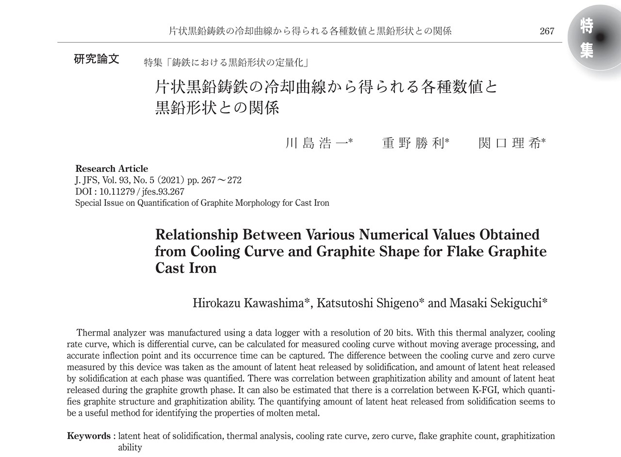 論文名:片状黒鉛鋳鉄の冷却曲線から得られる各種数値と黒鉛形状との関係