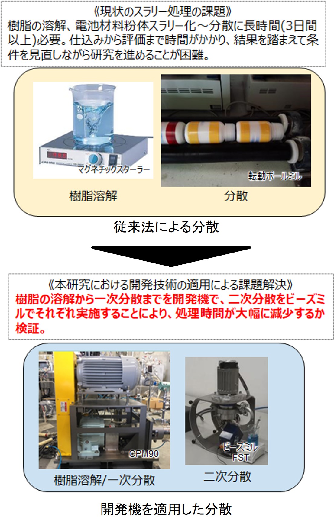 オブザーバー企業5社以上の協力で、複数の電池材料で従来と比べて、1/2以下の時間で均一に分散できることを確認した。