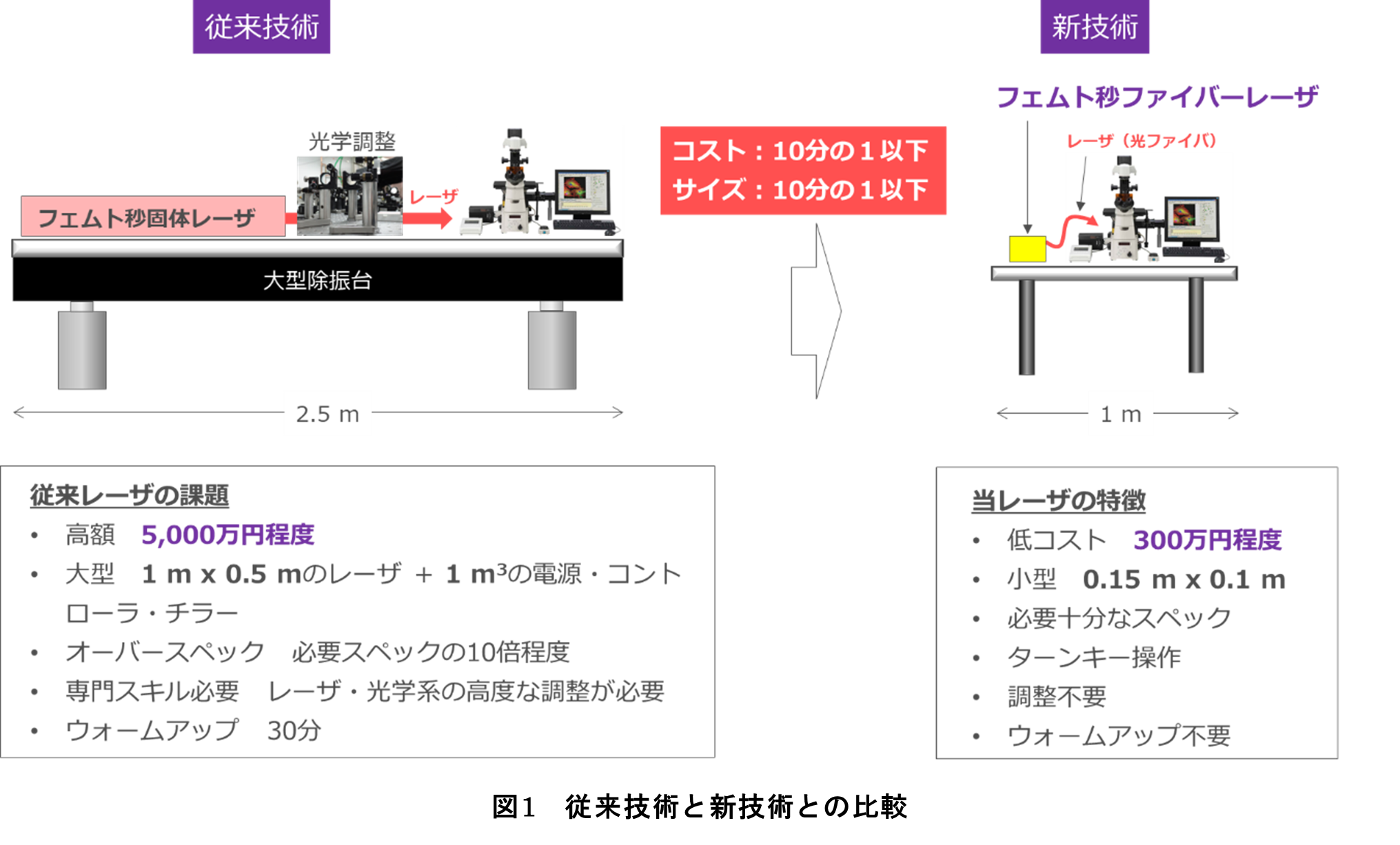 ・従来のフェムト秒固体レーザーに対してコスト10分の1以下、サイズ10分の1以下を実現
