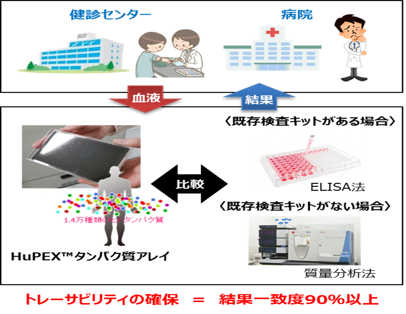 本事業では、1万4,000種類のヒトタンパク質の網羅的合成システムの開発と合成ヒトタンパク質による自己抗体の網羅的検出システムを世界で初めて可能にした技術を基盤とし、網羅型タンパク質アレイをベースとした検査用タンパク質アレイの量産システムおよび品質管理体制の構築を行った。そこから得られる測定結果と個人の健康診断情報等を統合するデータベースを開発し、未病の状態から疾患リスクを早期判別するAIアルゴリズムの開発までの「健診向け抗体ドック」の構築を目指した。本開発技術は、健康診断向けサービスとして、がんや生活習慣病、認知症などの疾患検査を提供するだけでなく、医療・創薬開発向けサービスとして高度化された抗体情報を提供し、人々の健康・診断・創薬を繋ぐプラットフォームとなることが期待される。