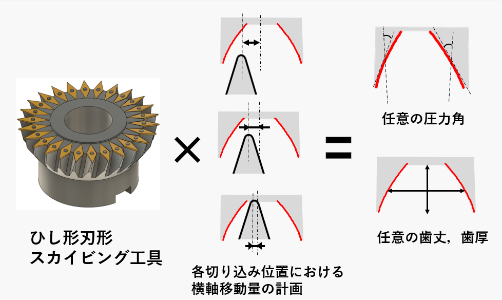 - 歯形を構成する各部位ごとに異なる工具姿勢を適用することで任意の形状を持つ歯形を一般的なスカイビング工具を用いて生成する加工条件を探索するシステム