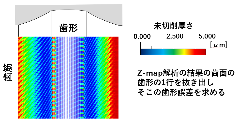 ・Z-Map形式の離散形状表現によるワーク形状記述システムの開発により、スカイビング工具の切れ刃通過軌跡によって除去される領域との間で各工具通過ごとの形状変化を追跡することで、歯面形状の推定を実現した