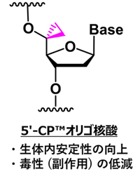 大阪大学大学院薬学研究科小比賀聡教授らのグループが創出した新規修飾核酸5'-CP™を搭載したオリゴ核酸は、生体内安定性と毒性改善の点で優れた特性を有する。当社においても、医薬品候補となる核酸分子の配列中に5'-CP™を組み込むことで、安全性を高められることを確認しており、この特性を生かした医薬品開発が拡大していくことを期待している。