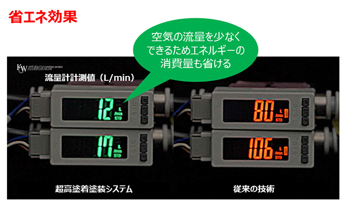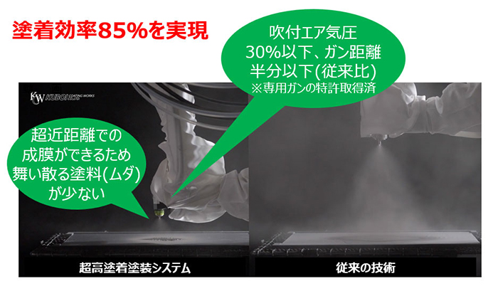 ・塗着効率85%を実現: 石油化学製品である塗料の使用効率向上によりコスト削減と廃棄物・エネルギー消費抑制