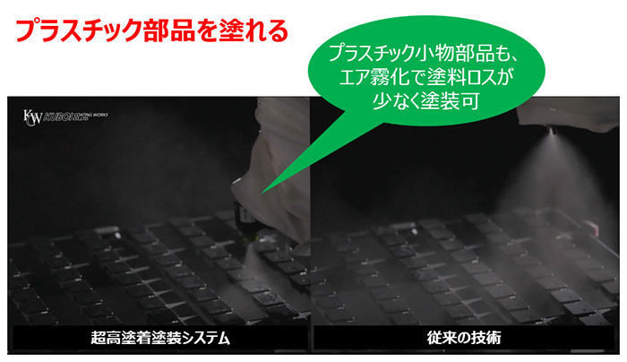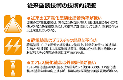 ・プラスチック部品への塗装対応: 静電気を使わずエア霧化技術を高度化して非導電体のプラスチック部品も塗装可能
