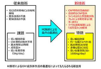 CNF中間素材製造装置・手法は成形時間を1/20(30分程度)に短縮し、コスト障壁を低減できるため、実用化が見込まれる。MI解析に基づく最適化システムにより、川下ニーズに合わせた物性設計が可能となり、応用分野拡大に資する。