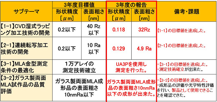 -超精密形状測定機を使用して10,000アレイMLA成形品の形状評価を行い、表面粗さ10nmRa以下の高精度な成形を確認した。