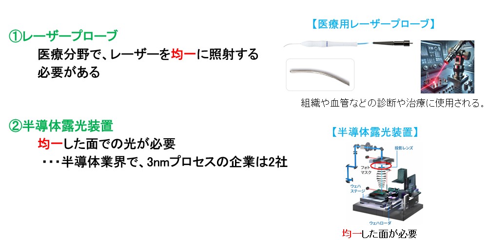 -本技術は幅広い分野での応用が可能である。通信分野における5G/6Gや光集積回路での信号損失低減と高速化に貢献する。AI/IoT分野ではスマートカメラや自動運転、スマートファクトリーにおいて高精度センシングを実現する。さらに、医療分野では顕微鏡・内視鏡・バイオチップの性能向上に寄与し、診断精度や遠隔医療を支援する。加えて、研究・教育分野では量子コンピューティングや光学研究、人材育成の基盤技術として活用できる。
