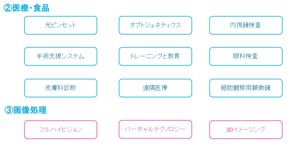 ・医療: 顕微鏡・内視鏡、バイオチップ応用による診断精度や遠隔医療の高度化