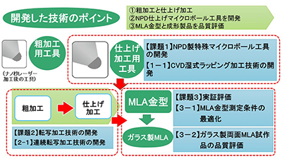 小型、省エネに資する光源として半導体レーザーが期待されているが、使用部品の耐熱性ガラス製マイクロレンズアレイ(MLA)の量産化は現製法上困難である。そこで、新規ガラス製両面MLAを金型で量産化するため、業界初のナノ多結晶ダイヤモンド(NPD)製マイクロボール工具と連続転写加工技術を開発し、超硬合金製MLA金型製造方法を確立させ、更にガラス製両面MLA製品の大量生産体制を確立させる。