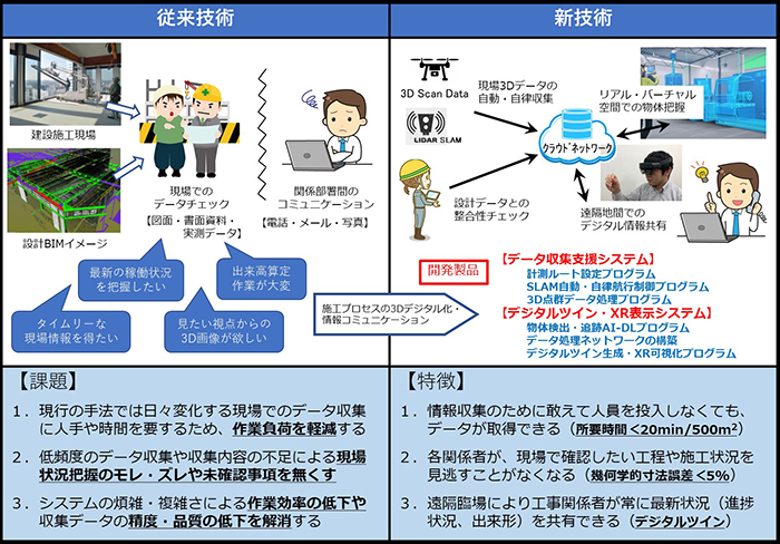 最新のArtificial Intelligence(AI)、Internet of Things(IoT)、3Dモデリング、画像処理およびICTプラットフォーム等を基盤技術として建設現場での生産性の大幅な向上を目指すソフトウェアの製品化を図る研究である。具体的には、現場を3Dスキャナや3Dカメラで撮影し、サポート部署で確認するための「データの取得、取得データの判別、データベース化、情報の可視化、情報の評価・検証」といった工程において「データの取得」の半自動化と「情報の可視化」におけるデジタル検査・監理・点検に用いられるExtended Reality(XR)画像表示技術の開発を行った。これらの技術により施工管理担当者が行う安全巡回や現地確認を遠隔地からも容易に実現し、作業現場への移動時間や現地滞在時間短縮を目指した。