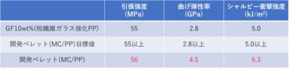 -MC40%配合でGF10の公称値を上回る性能を達成(引張強度56MPa、曲げ弾性率4.5GPa、シャルピー衝撃強度6.3kJ/平方メートル)